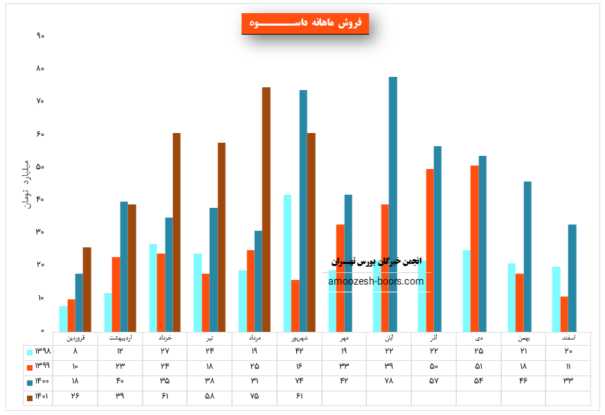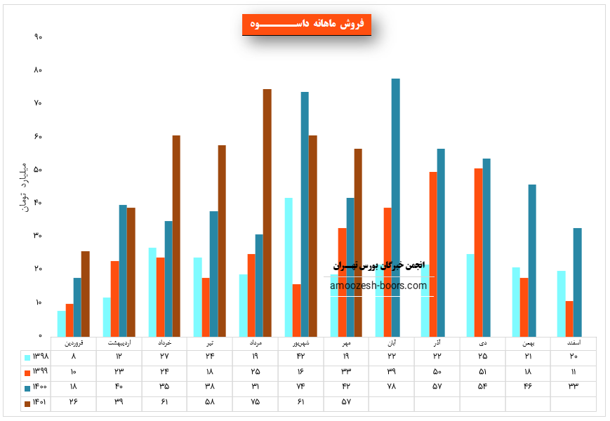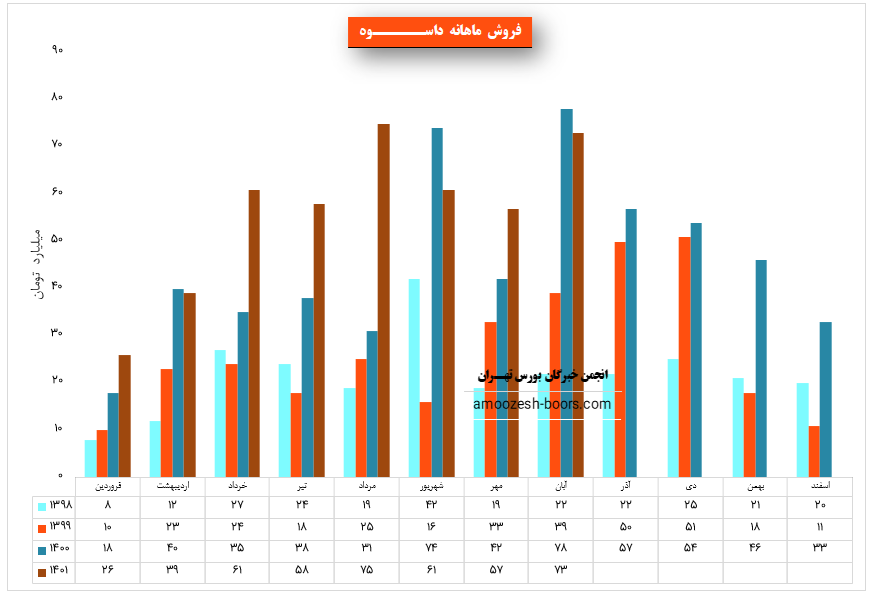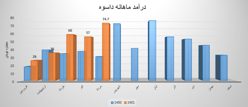 سهم داسوه در دوره یک ماهه منتهی به 31 مرداد ماه 1401، مبلغ 74.7 میلیارد تومان درآمد داشته که نسبت به ماه قبل 29% افزایش و نسبت به میانگین ماه های قبل 63% افزایش داشته است.