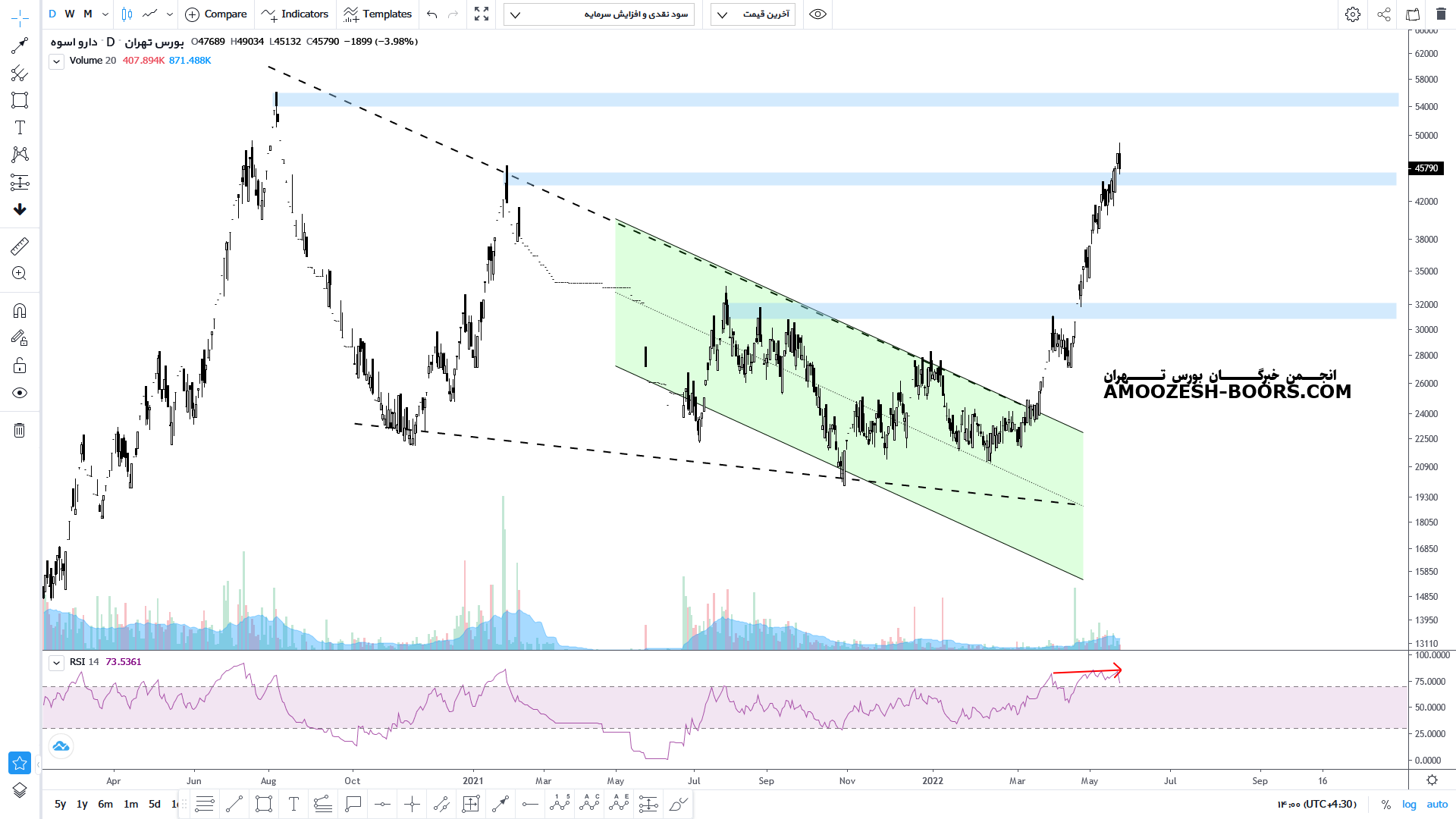 قیمت سهم داسوه پس از شکست مقاومت محدوده خط روند نزولی خود توانسته پرقدرت مقاومت های مهم پیش روی خود را از سر راه بردارد اکنون نیز درگیر محدوده مقاومتی ۴ هزار و ۶۰۰ تومان می باشد که در صورت شکست و تثبیت می تواند به سوی مقاومت تاریخی خود یعنی محدوده ۵۴۰۰ تومان حرکت کند اما در صورت عدم تثبیت و برگشت به زیر مقاومت شکسته شده می تواند محدوده حمایتی ۳,۲۰۰ تومان را تست کند. که با توجه به کاهش قدرت خریداران این امر محتمل می باشد هرگونه سرمایهگذاری در این قیمت ها نیز پر ریسک محسوب میشود.