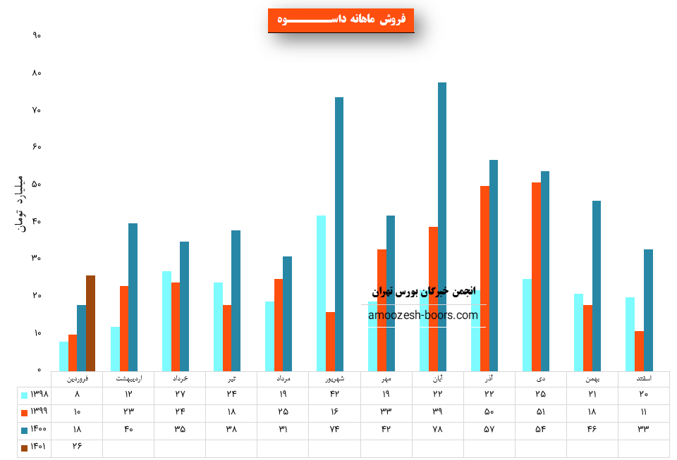 سهم داسوه در فروردین ماه ۱۴۰1 حدود مبلغ 26 میلیارد تومان درآمد داشته که این میزان در مقایسه با ماه گذشته 21% کاهش و همچنین در مقایسه با مدت مشابه سال گذشته 44% رشد درآمد پیدا کرده است.