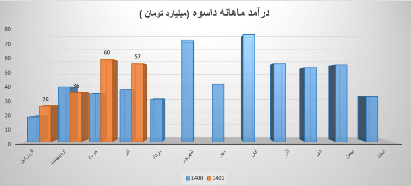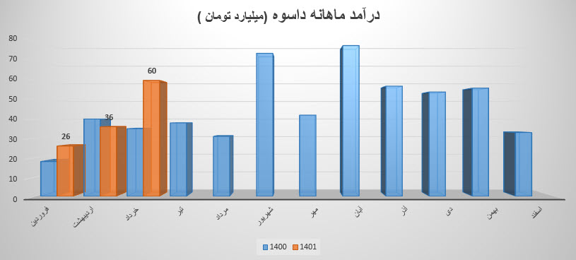 سهم داسوه در خرداد ماه مبلغ 60.7 میلیارد تومان درآمد داشته که نسبت به ماه قبل 56% افزایش و نسبت به میانگین ماه های قبل 87% افزایش داشته است.