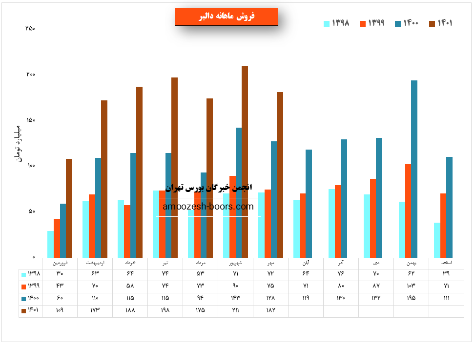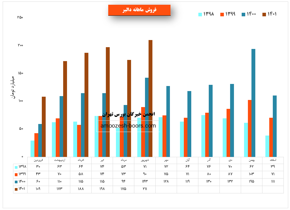 شرکت دالبر (دارو سازی البرز دارو) در شهریور ماه ۱۴۰1 حدود مبلغ 211 میلیارد تومان درآمد داشته که این میزان در مقایسه با ماه گذشته 21% و همچنین در مقایسه با مدت مشابه سال گذشته 48% رشد درآمد پیدا کرده است.