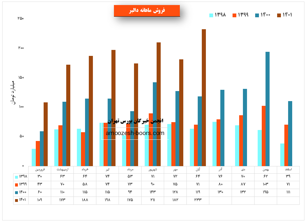 شرکت دالبر (دارو سازی البرز دارو) در آبان ماه ۱۴۰1 حدود مبلغ 233 میلیارد تومان درآمد داشته که این میزان در مقایسه با ماه گذشته 28% و همچنین در مقایسه با مدت مشابه سال گذشته 96% رشد درآمد پیدا کرده است.