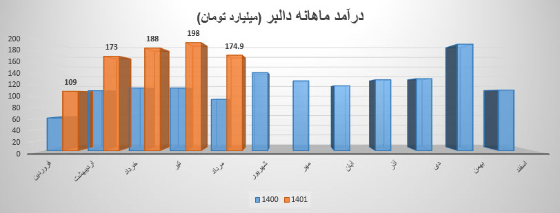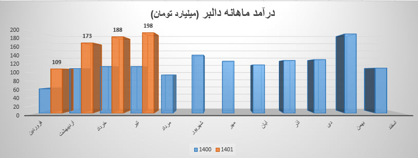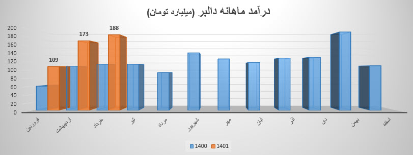 سهم دالبر در خرداد ماه 1401 معادل مبلغ 188.3 میلیارد تومان درآمد داشته که نسبت به ماه قبل 9% افزایش و نسبت به میانگین ماه های قبل 33% افزایش و نسبت به دوره 1 ماهه مشابه سال قبل 64% افزایش درآمد داشته است.