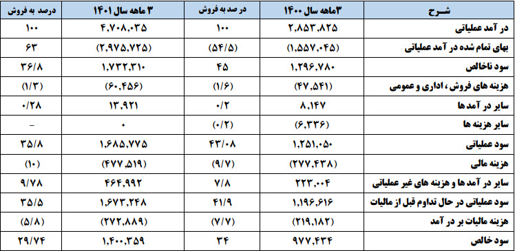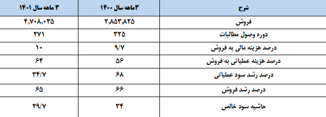 سود ناخالص 34% رشد، سود عملیاتی 35 درصد، درآمد عملیاتی 65 درصد و هزینه های مالی نیز 72 درصد و فروش شرکت به میزان 165 درصد نسبت به مدت مشابه رشد داشته است.