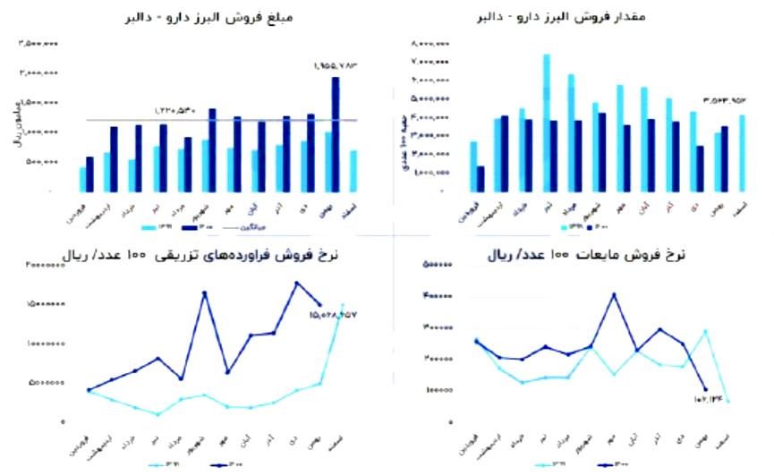 سهم دالبر در اسفند ماه حدود بیش از 3 میلیون و 500 هزار عدد از محصولات خود را در بازار داخلی و حدود بیش از 51 هزار عدد از محصولات خود را بصورت صادرات و همچنین بیش از 1 میلیون و 400 هزار عدد از محصولات خود را بصورت ارائه خدمات به فروش رسانده که این میزان در مقایسه با حجم فروش ماه گذشته خود حدود 43% افزایش پیدا کرده است.