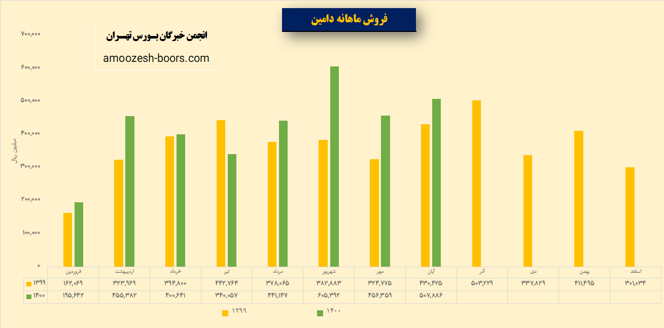سهم دامین در آبان ماه حدود 51 میلیارد تومان فروش داشت که این میزان نسبت به ماه گذشته با 11% رشد و همچنین با 18% رشد نسبت به مدت مشابه سال گذشته به ثبت رسیده است.