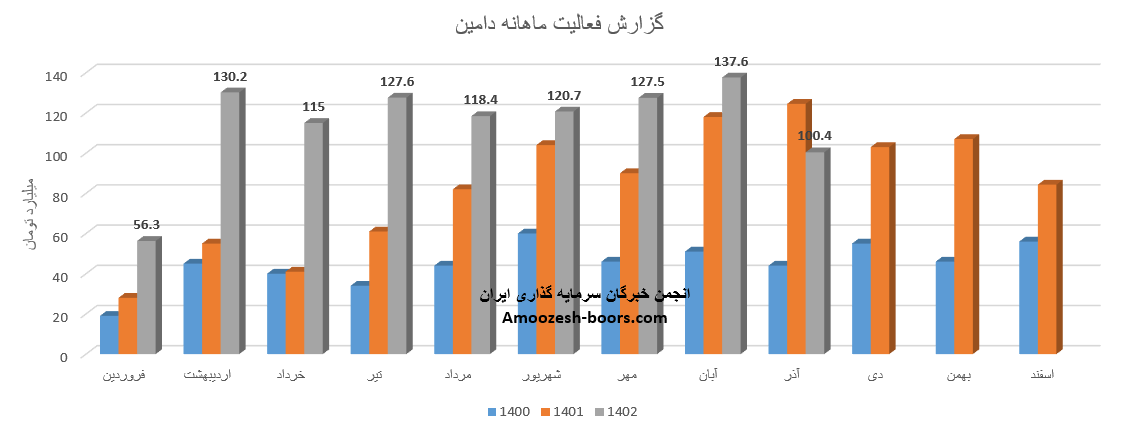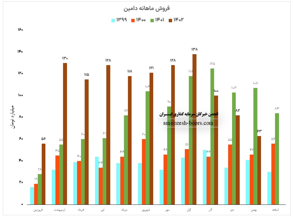 فروش آذر ماه سال 1402 سهم دامین 100.4 میلیارد تومان گزارش شده است، تغییرات درآمدی دامین به شرح زیر میباشد: