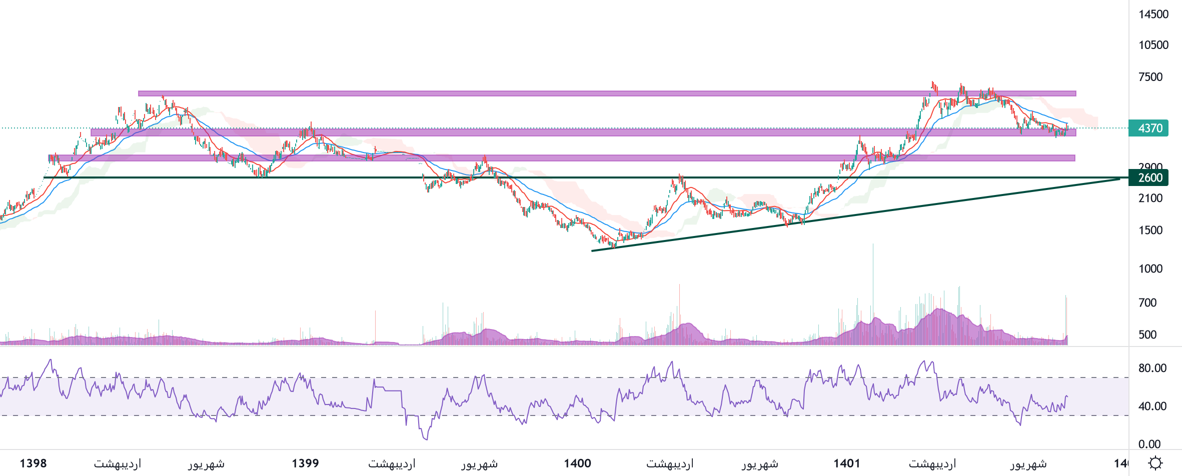 قیمت نماد دامین روی محدوده حمایتی 4000 ریال در حال نوسان میباشد، در صورت تثبیت و بیس سازی قیمت در این محدوده حرکت دامین تا 6000 ریال محتمل خواهد بود، همچنین در صورت از دست رفتن این محدوده، حمایت بعدی 3000 ریال در نظر گرفته خواهد شد.