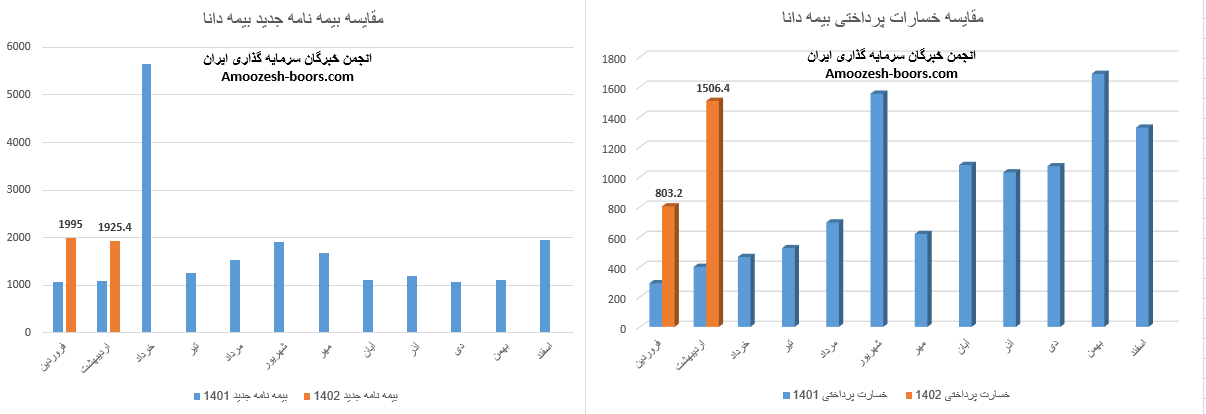 نماد دانا (شرکت بیمه دانا) در خرداد ماه سال 1402 حدود مبلغ 7600 میلیارد تومان بیمه نامه جدید صادر کرده که این میزان در مقایسه با ماه گذشته 295% افزایش پیدا کرده است.