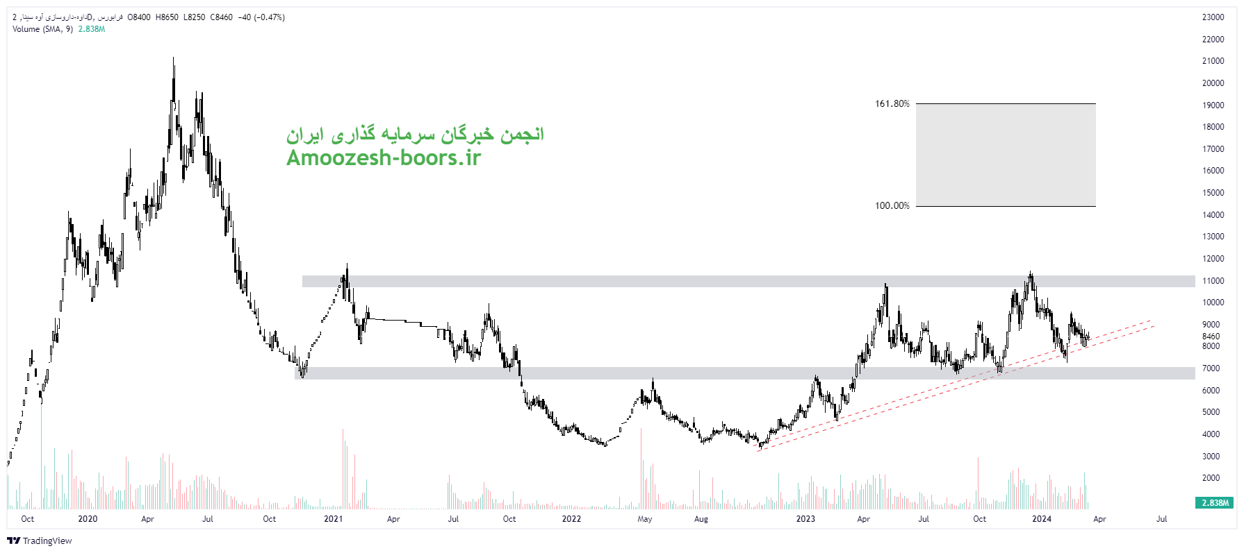 1. حمایت داوه 10000 ریال: این سطح به‌عنوان یک نقطه حیاتی برای جلوگیری از اصلاح بیشتر قیمت عمل می‌کند، اگر قیمت به زیر این سطح نفوذ کند، انتظار می‌رود که حمایت بعدی در محدوده 9000 ریال قرار داشته باشد.