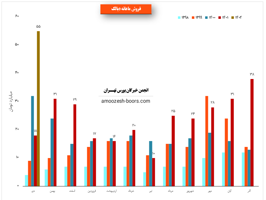 سهم دبالک در دی ماه حدود 14400 کیلوگرم از محصولات خود را به فروش رساند که این میزان در مقایسه با حجم فروش ماه گذشته حدود 19% کاهش پیدا کرده است.