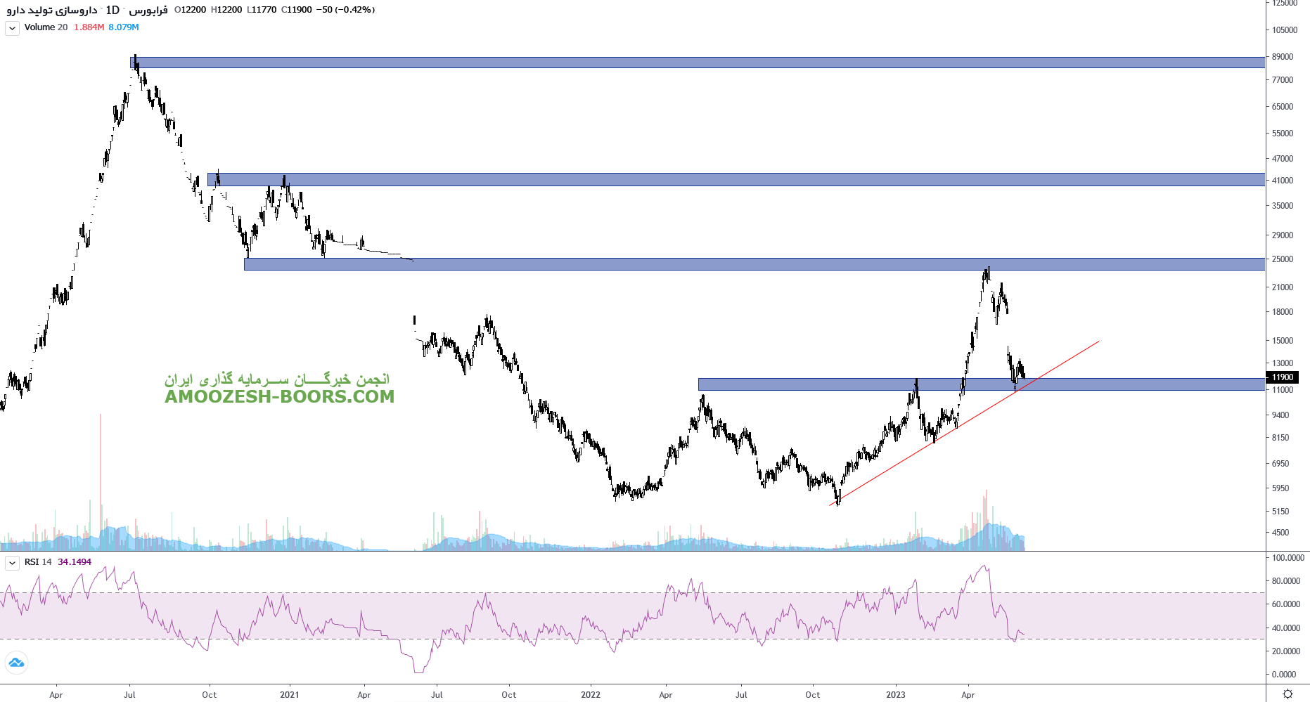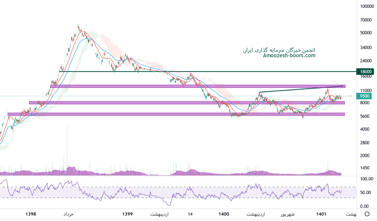 نماد دتولید محدوده حمایتی 8000 ریال را دارا میباشد، در صورت تثبیت قیمت در این محدوده، 12000 ریال تارگت اول سهم در نظر گرفته خواهد شد، همچنین در صورت از دست رفتن این سطح حمایتی، حمایت بعدی 6000 ریال ارزیابی خواهد شد.