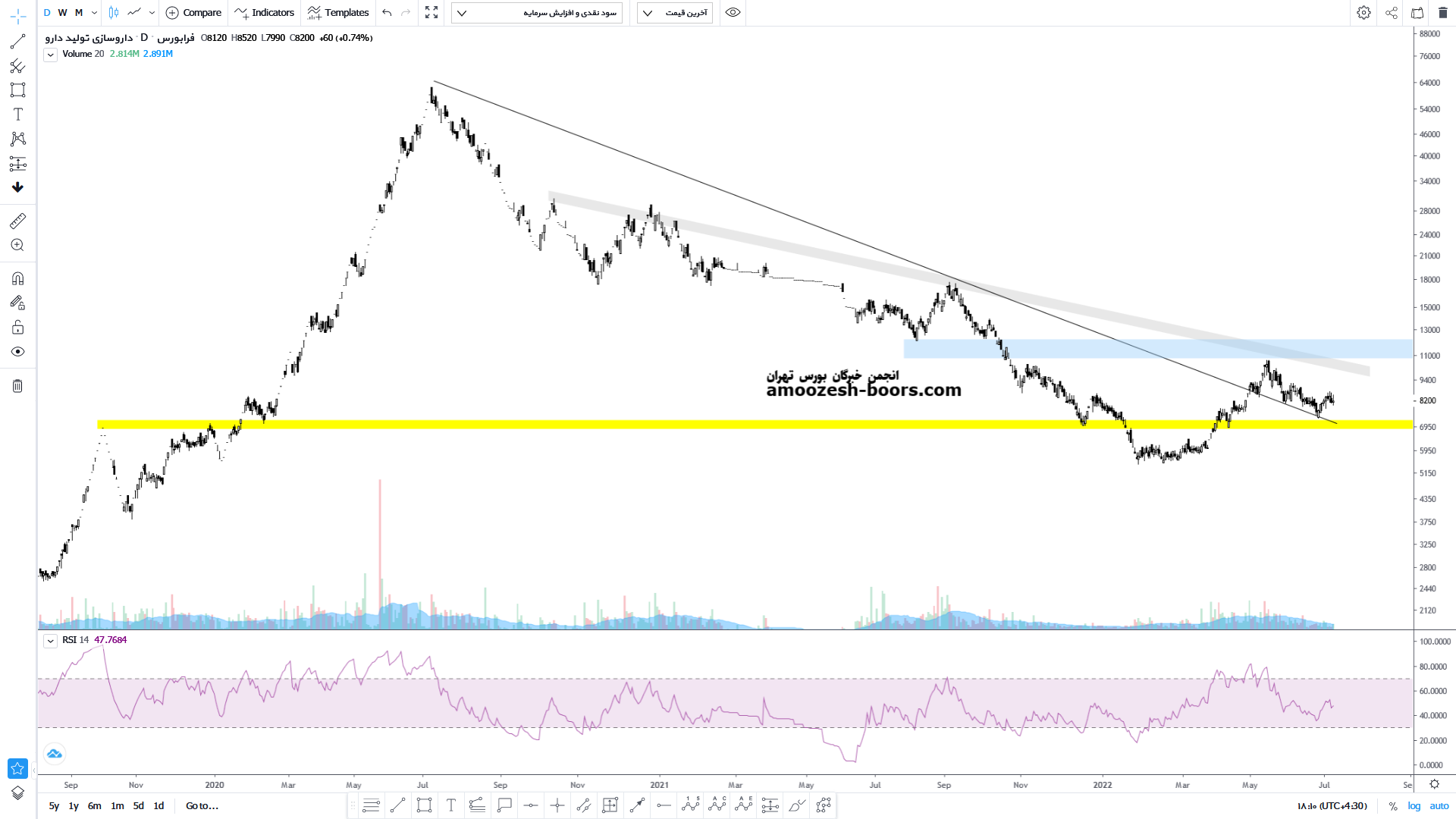 نماد دتولید در حال حاضر حمایت 5600 ریال را دارا میباشد، در صورت تثبیت قیمت حرکت سهم تا 7000 ریال دور ازذهن نخواهد بود، همچنین در صورت از دست رفتن این حمایت، حمایت بعدی 4300 ریال در نظر گرفته خواهد شد که در اینصورت حد ضرر سهم دتولید فعال میگردد.