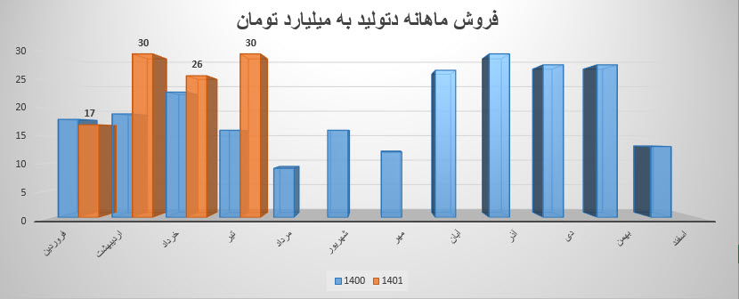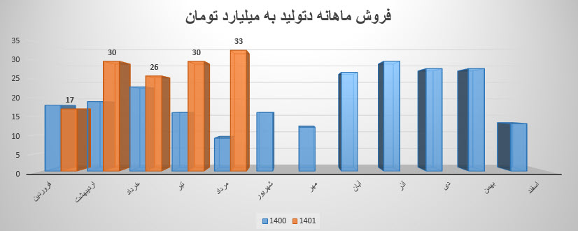 نماد دتولید طی عملکرد 1 ماهه منتهی به 1401/05/31 معادل 331,754 میلیون ریال از محصولات خود را به فروش رسانده است که نسبت به دوره 1 ماهه مشابه سال قبل 267% افزایش داشته است. درامد شرکت نسبت به ماه قبل 10 درصد و نسبت به میانگین ماهانه 28 درصد افزایش داشته است .