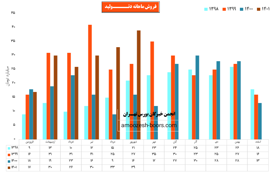 نماد دتولید در شهریور ماه سال ۱۴۰۱ حدود مبلغ 39 میلیارد تومان درآمد داشته که این میزان در مقایسه با ماه گذشته 18% و همچنین در مقایسه با مدت مشابه سال گذشته 144% رشد درآمد را تجربه کرده است.