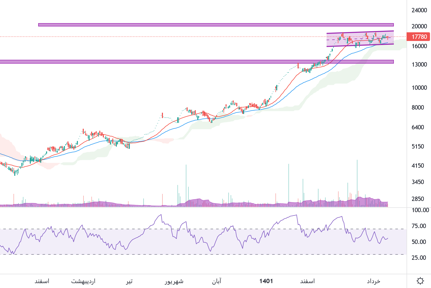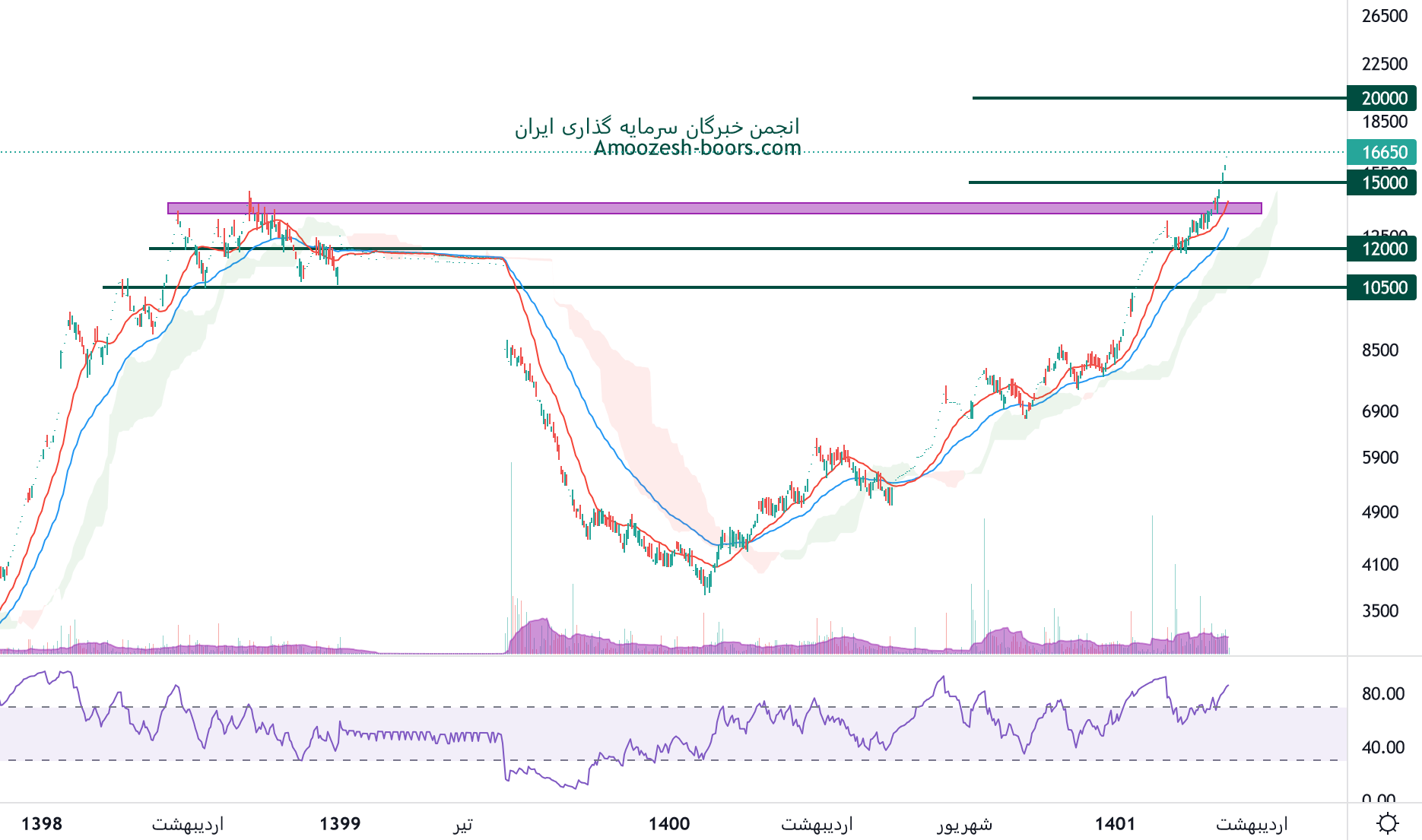 نماد دحاوی پر قدرت از سطح مقاومتی 15000 ریال عبور کرده و حرکت خود به سمت سطح مقاومتی 20000 ریال را شروع کرده است، مادامی که سهم حمایت 14000 ریال را حفظ کند توصیه به فروش نداریم، حمایت بعدی 12000 ریال ارزیابی میگردد.