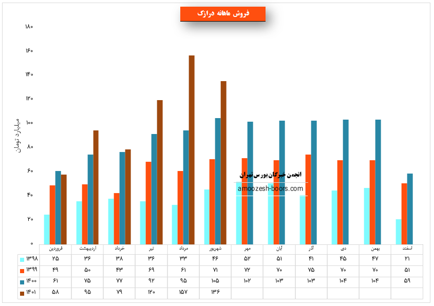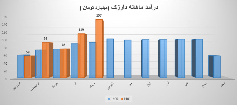 سهم درازک در مرداد مبلغ 157.1 میلیارد تومان درآمد داشته است که نسبت به ماه قبل 31% افزایش و نسبت به میانگین ماه های قبل 79% افزایش داشته است.