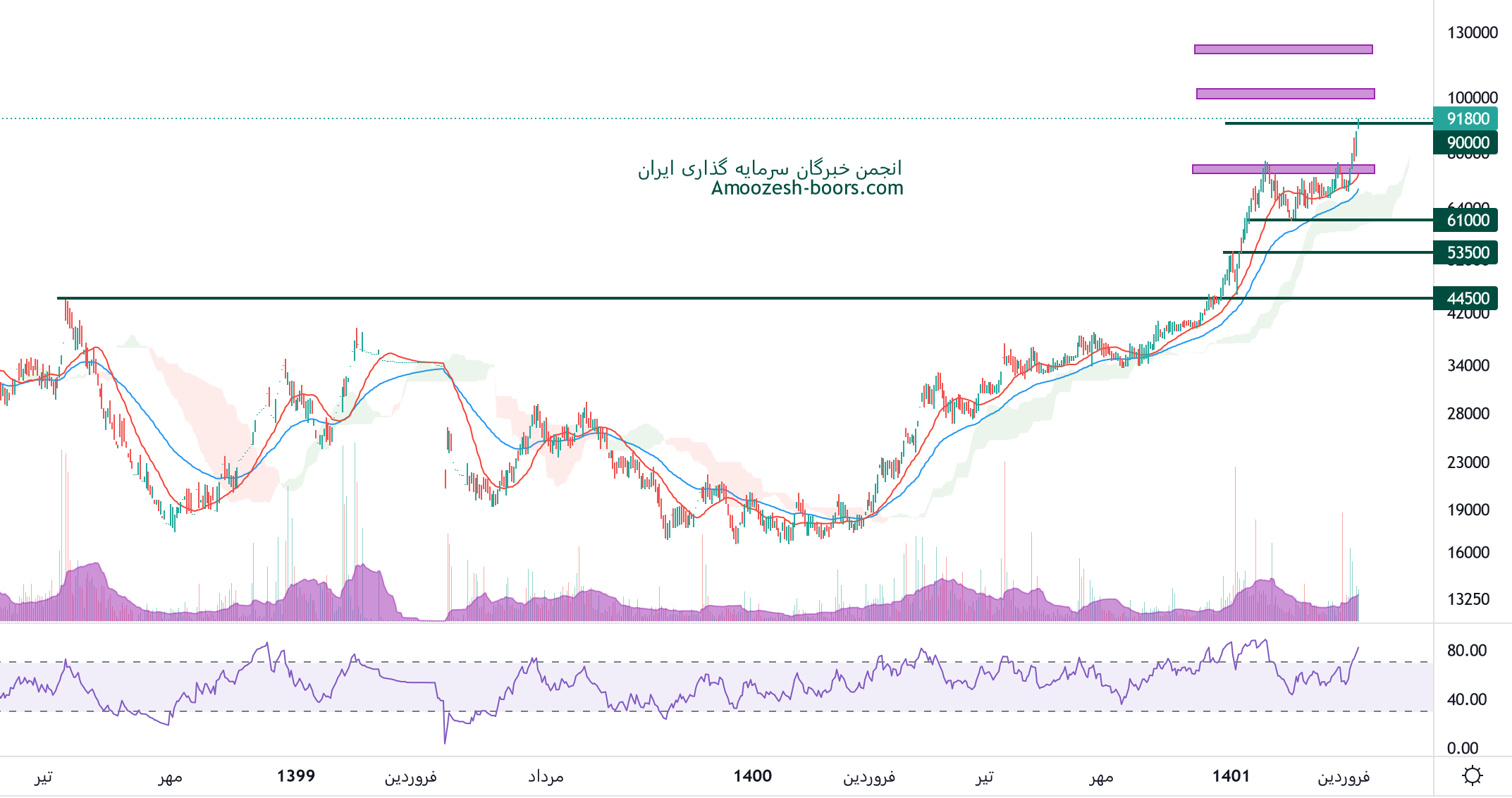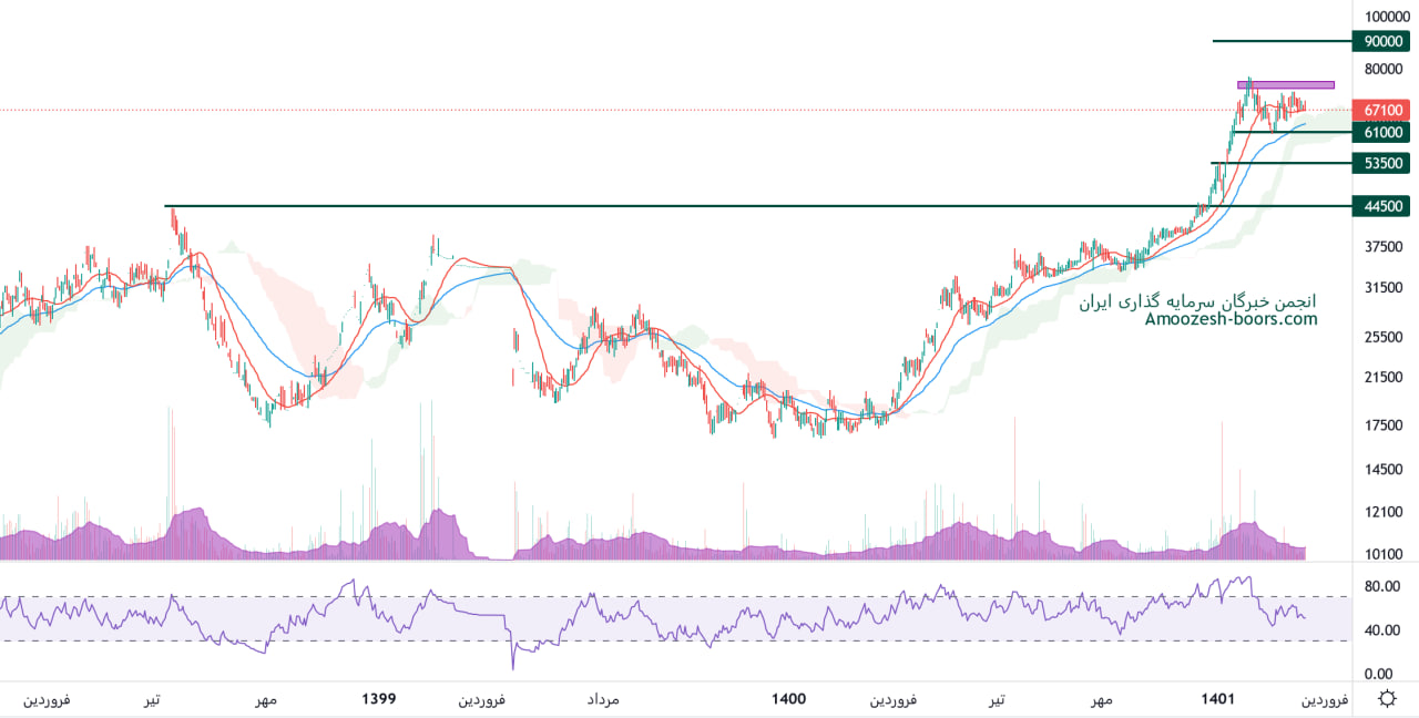 نماد درهآور در حال نوسان در این محدوده قیمتی میباشد و مقاومت 75000 ریال را دارا میباشد، در صورت عبور قیمت از این محدوده، حرکت سهم درهآور تا 90000 ریال محتمل خواهد بود، همچنین اولین حمایت 61000 ریال ارزیابی میگردد.