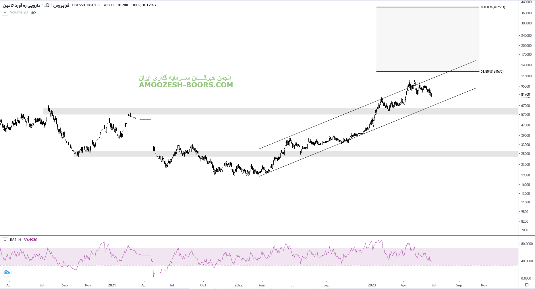 قیمت سهم درهآور در قالب یک کانال صعودی در حال حرکت می باشد. اولین حمایت سهم درهاور نیز ناحیه کف کانال صعودی یعنی ناحیه ۷۵۰۰ تومان می باشد که در صورت حفظ این ناحیه، اولین مقاومت سهم درهآور ناحیه ۱۲,۵۰۰ تومان میباشد.