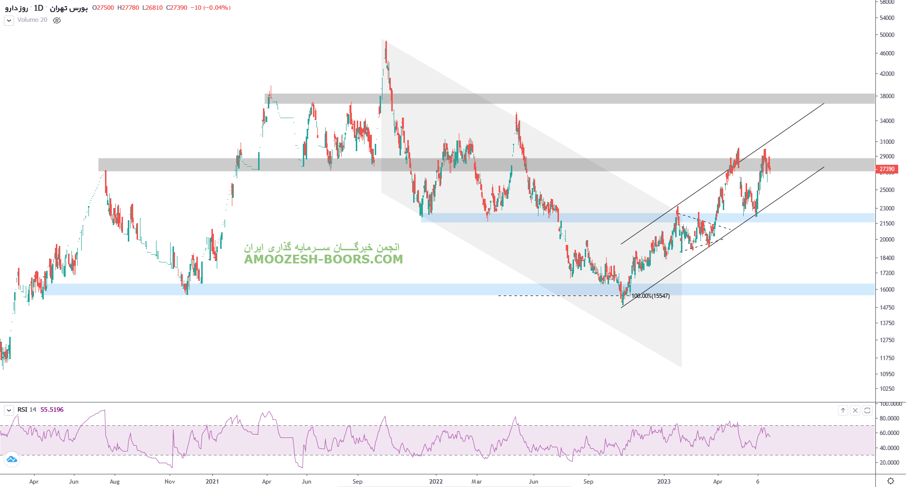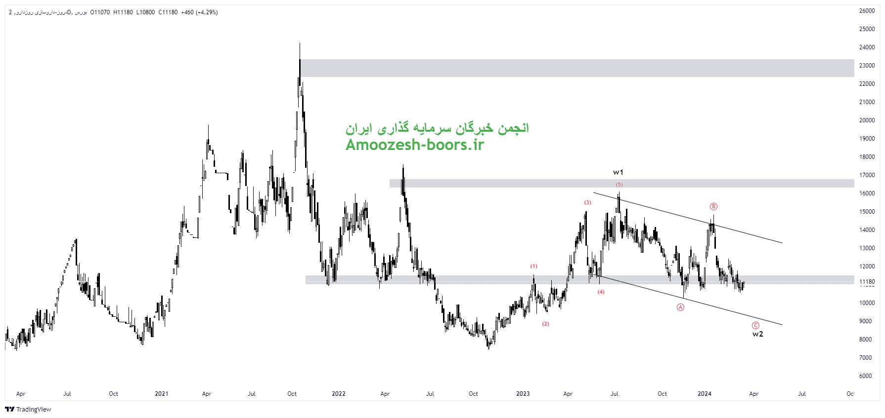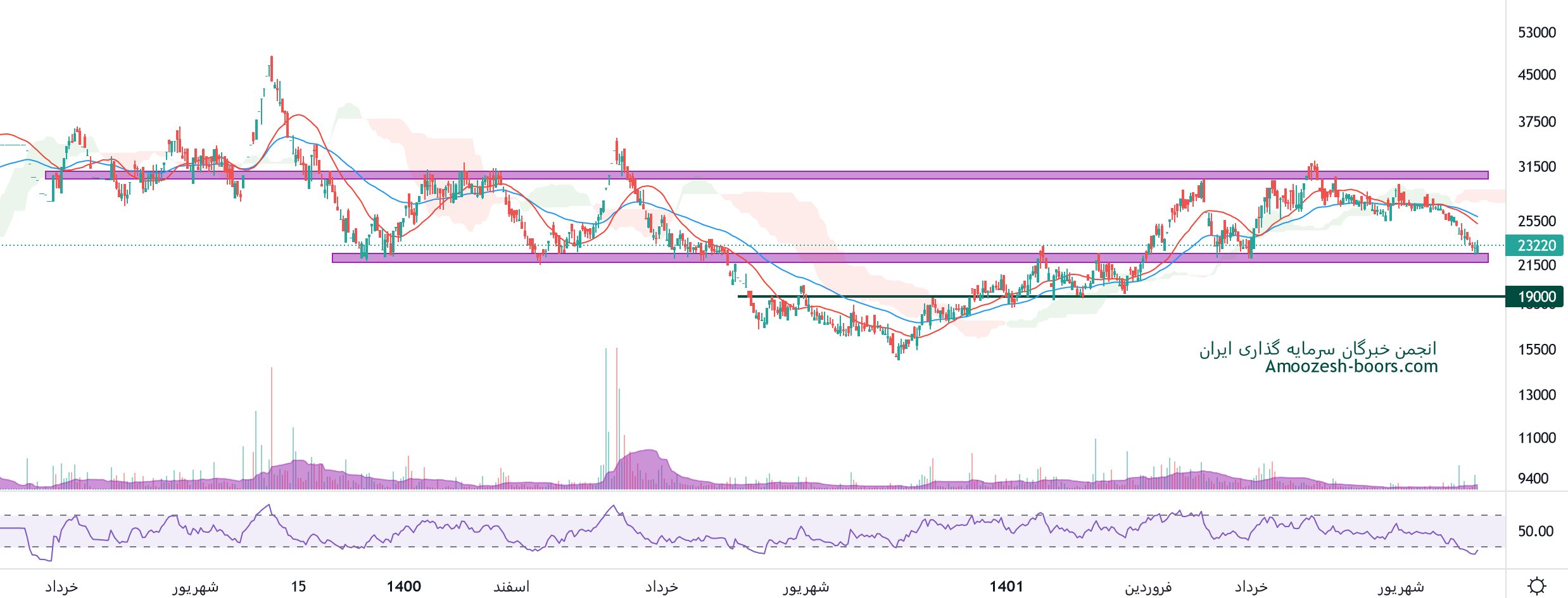 قیمت سهم در روز در حال تست دوباره ناحیه مقاومتی ۲۸۰۰ تومان می باشد لذا در صورت شکست این ناحیه مقاومت بعدی سهم دروز ناحیه سقف کانال صعودی ۳۲۰۰ تومان و 3800 تومان می باشد اما در صورت بروز واکنش منفی نسبت به این ناحیه مقاومتی، حمایت بعدی سهم دروز ناحیه ۲۴۰۰ تومان در نظر گرفته خواهد شد.