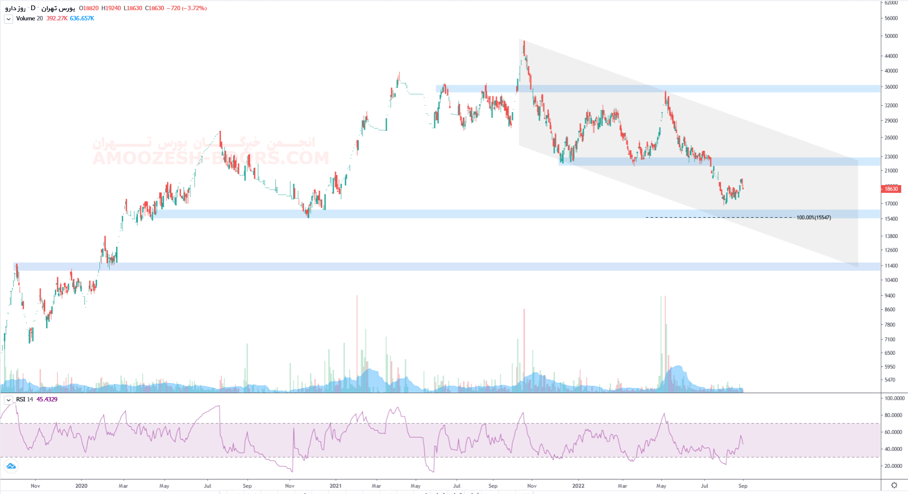قیمت سهم دروز پس از شکست و از دست دادن ناحیه حمایتی ۲۲۰۰ تومان در حال حرکت به سمت ناحیه حمایتی ۱۶۰۰ تومان می باشد این ناحیه حمایتی بسیار قوی و مستحکم می باشد ولذا پیش بینی می شود که سد راه قیمت از ریزش بیشتر شود اما در صورت از دست رفتن این ناحیه حمایتی نیز ناحیه حمایتی ۱۱۰۰ تومان میتواند موجب برگشت قیمت شود. در صورت برگشت قیمت از هر یک از این نواحی، مقاومت های ۲۲۰۰ تومان و همچنین سقف کانال نزولی از جمله مقاومت های مهم پیش روی سهم می باشند.