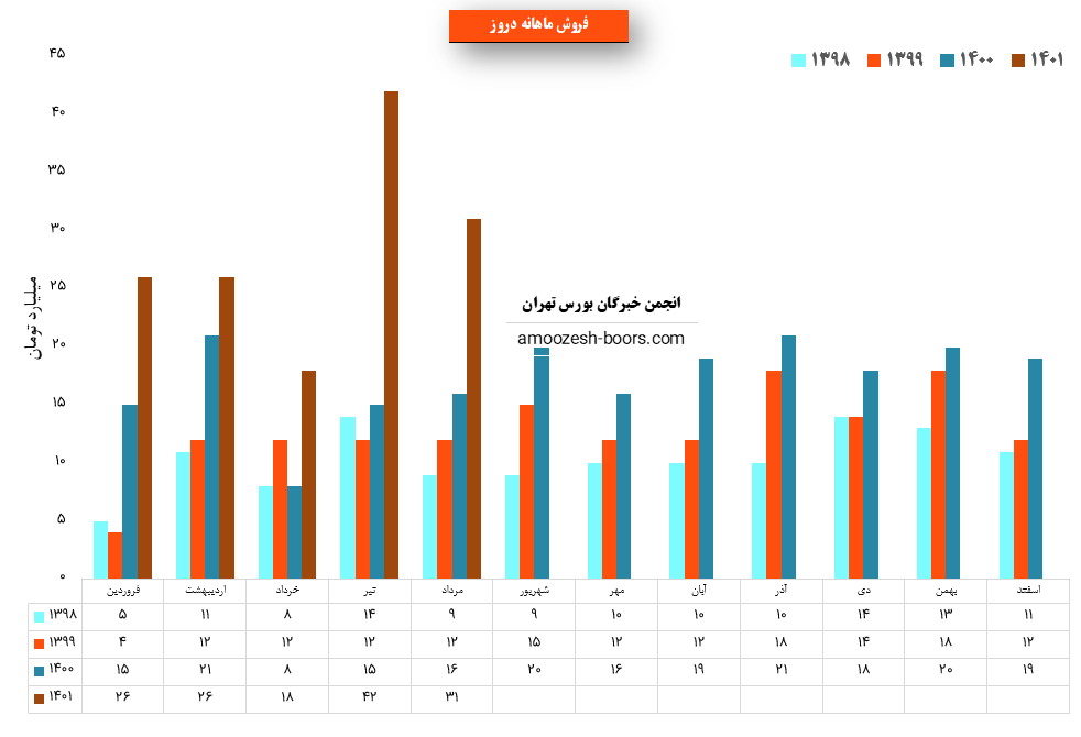 شرکت روزدارو در گزارش تیر ماه خود معادل 416,413 میلیون ریال از محصولات خود را به فروش رسانده است که نسبت به ماه قبل 128% افزایش و نسبت به میانگین ماه های قبل 76% افزایش و نسبت به دوره 1 ماهه مشابه سال قبل 173% افزایش درآمد داشته است.