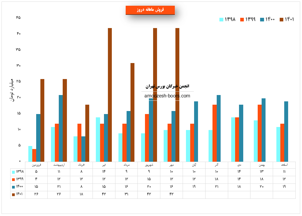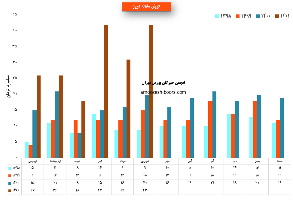 شرکت دارو سازی روز دارو با نماد دروز در مهر ماه ۱۴۰1 حدود مبلغ 42 میلیارد تومان درآمد داشته که این میزان در مقایسه با ماه گذشته بدون تغییر و همچنین در مقایسه با مدت مشابه سال گذشته 163% رشد درآمد پیدا کرده است.