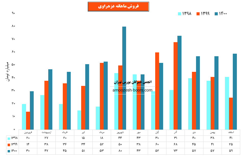 سهم دزهراوی در اسفند ماه حدود بیش از 67 میلیون عدد از محصولات خود را به فروش رسانده که این میزان در مقایسه با حجم فروش ماه گذشته خود حدود 34% افزایش پیدا کرده است.