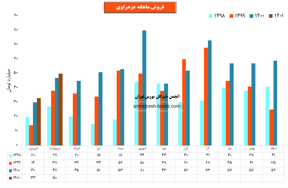 سهم دزهراوی در اردیبهشت ماه حدود بیش از 57 میلیون عدد از محصولات خود را به فروش رسانده که این میزان در مقایسه با حجم فروش ماه گذشته خود حدود 98% افزایش پیدا کرده است.