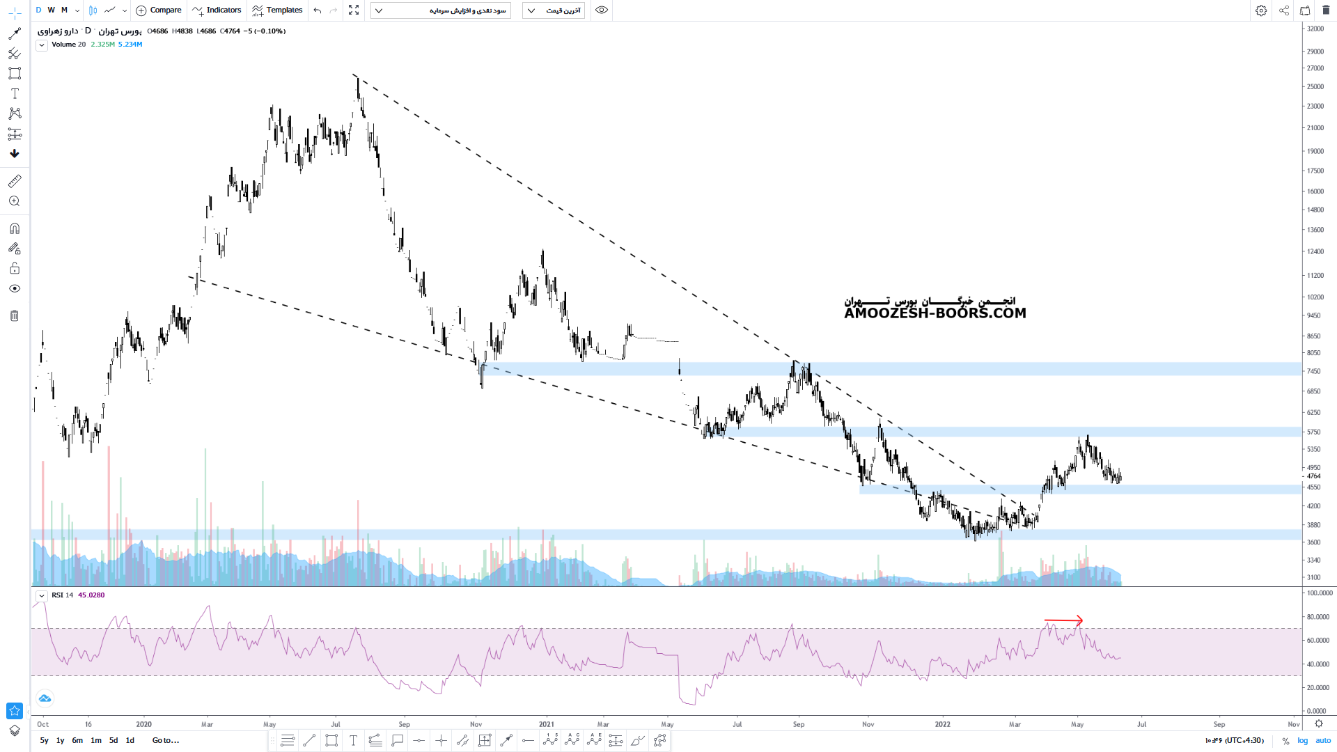 قیمت سهم دزهراوی پس از خروج از کف الگوی فشرده شده با گیر کردن بر روی محدوده حمایتی ۳۷۰ تومان و حمایت از این محدوده توانسته مجدد رشدی را تجربه کند که طی این موج صعودی با برخورد مقاومت مهم محدوده ۵۸۰ تومان واکنش منفی را از خود بروز داده است اکنون پس از اصلاح بر روی حمایت محدوده ۴۵۰ تومان قرار دارد که در صورت حمایت می تواند مقاومت محدوده ۵۸۰ تومان را مجدد تست کند در صورت شکست آن می تواند سیگنال خروج صادر و تا مقاومت منفی ۷۴۰ نیز رشد خود را ادامه دهد اما از دست رفتن این حمایت می تواند باعث اصلاح بیشتر قیمت سهم دزهراوی تا محدوده ۳۷۰ تومان بشود.