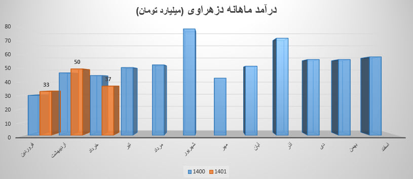 سهم دزهراوی در اردیبهشت ماه ۱۴۰1 حدود مبلغ 50 میلیارد تومان درآمد داشته که این میزان در مقایسه با ماه گذشته 52% و همچنین در مقایسه با مدت مشابه سال گذشته 6% رشد درآمد پیدا کرده است.