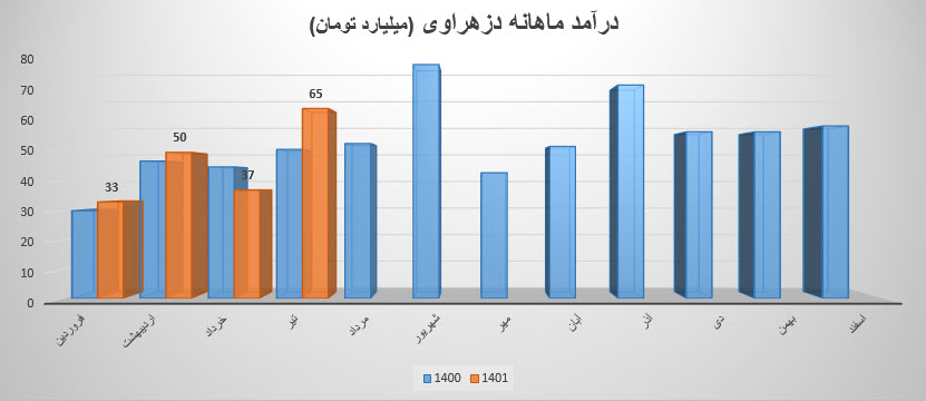 سهم دزهراوی در فروردین ماه ۱۴۰1 حدود مبلغ 33 میلیارد تومان درآمد داشته که این میزان در مقایسه با ماه گذشته 44% کاهش و همچنین در مقایسه با مدت مشابه سال گذشته 10% رشد درآمد پیدا کرده است.