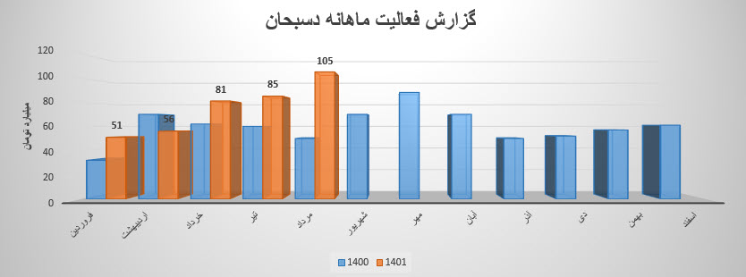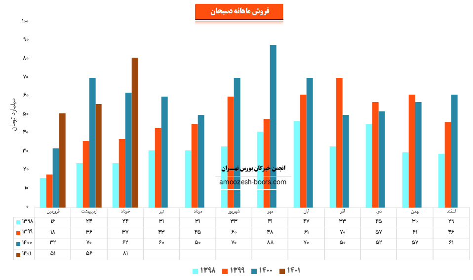 نماد دسبحان در دوره یک ماهه منتهی به 31 تیر ماه 1401، مبلغ 84.9 میلیارد تومان درآمد داشته که نسبت به ماه قبل 5% افزایش و نسبت به میانگین ماه های قبل 36% افزایش و نسبت به دوره 1 ماهه مشابه سال قبل 42% افزایش درآمد داشته است.