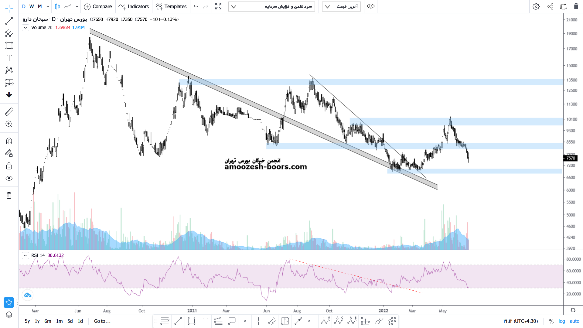 قیمت سهم دسبحان پس از برخورد به مقاومت مهم محدوده 1000 تومان با بروز واکنش منفی نسبت به این محدوده مقاومتی وارد فاز اصلاحی شده است که پس از درگیری با محدوده حمایتی ۸۰۰ تومان بلاخره با شکست این محدوده و از دست دادن این محدوده حمایتی اکنون سهم دسبحان راهی حمایت محدوده ۷۰۰ تومان میباشد که در صورت حمایت می تواند مجدد حمایت از دست رفته محدوده ۸۰۰ تومان را تست کند در صورت شکست آن مقاومت محدوده 1000 تومان را پیش روی خود خواهد داشت.