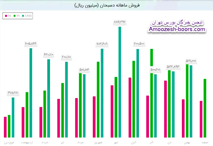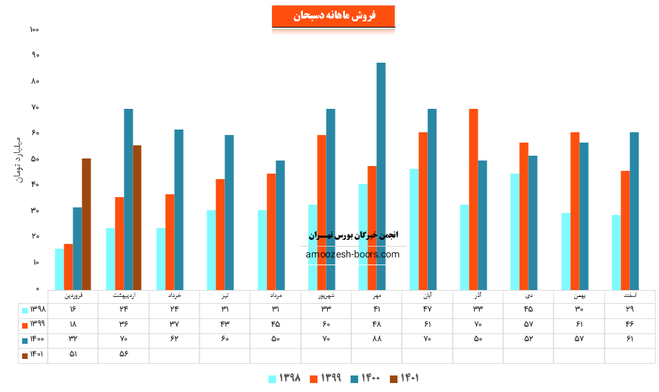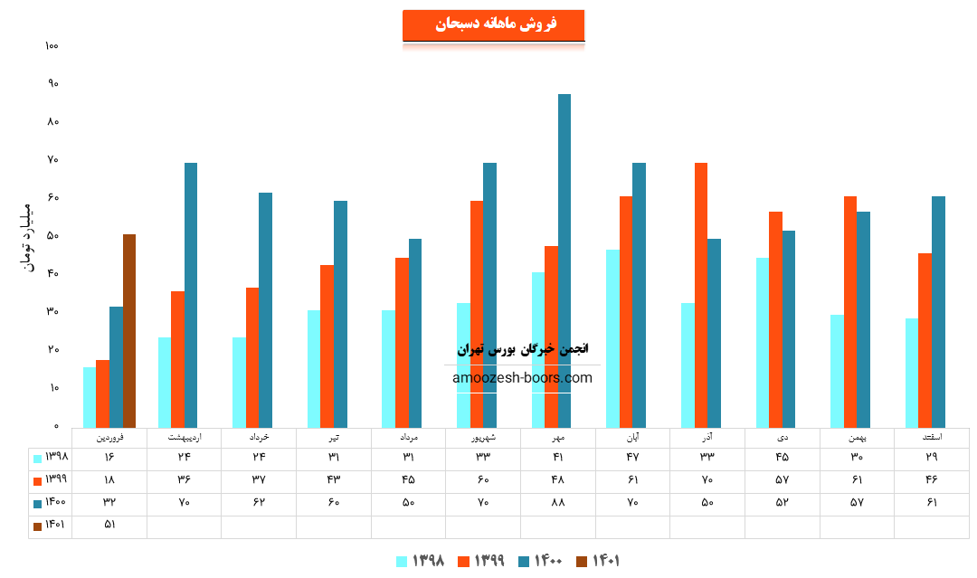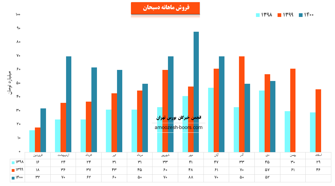 نماد دسبحان در دی ماه 1400 مبلغ 52 میلیارد تومان درامد داشته که در مقایسه با ماه گذشته 4 درصد رشد و همچنین در مقایسه با مدت مشابه سال گذشته 9 درصد افت درامد داشته است .