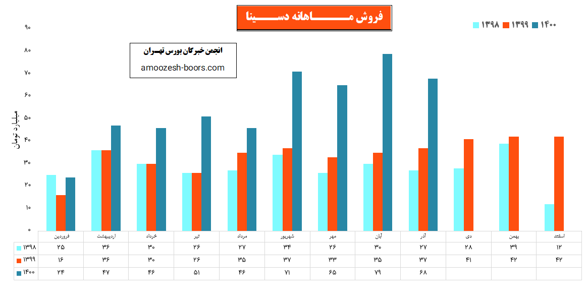 سهم دسینا در آذر 1400 مبلغ 68 میلیارد تومان درامد داشته که این میزان نسبت به ماه گذشته 14% افت و همچنین نسبت به مدت مشابه سال گذشته 84% رشد پیدا کرده است!
