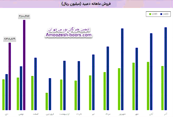 سهم دعبید در آذر 280 میلیارد تومان فروش ثبت کرد که نسبت به ماه گذشته 7.5 درصد افزایش داشته است. مجموع فروش شرکت در 12 ماهه سال مالی ( منتهی به آذر ) برابر با 2350 میلیارد تومان است که 58 درصد بیشتر از مدت مشابه سال قبل است. مقدار فروش شرکت نسبت به مدت مشابه سال گذشته 3 درصد رشد داشته است.
