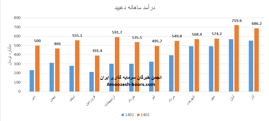 فروش آذر ماه سال 1402 سهم دعبید 686.2 میلیارد تومان گزارش شده است، تغییرات درآمدی دعبید به شرح زیر میباشد:
