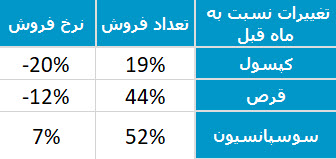 مقدار تولیدات سهم در این ماه 40 درصد کمتر از ماه قبل و مقدار فروش 48 درصد کمتر از ماه قبل است. نرخ فروش انواع قرص 66 درصد و نرخ کپسول 217 درصد بیش از ماه قبل گزارش شده است.