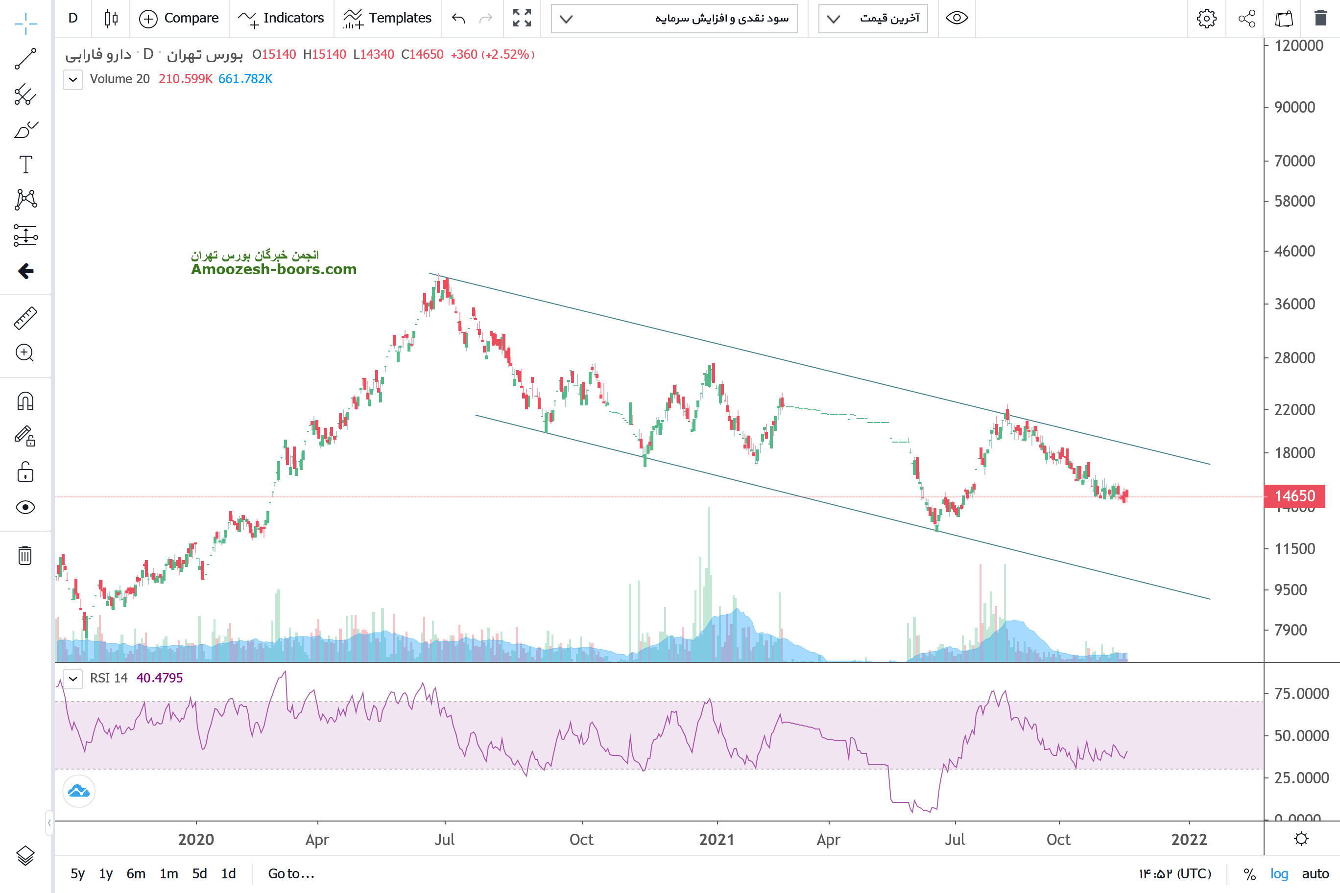 همانطور که در چارت سهم دفارا پیداست ، ازممنتوم و فشار فروش کاسته شده است مقاومت 17500 درصورت تثبیت قیمت بر سر راه سهم دفارا قرار گرفته و اولین سطح حمایتی 12500 وموقعیت تکنیکالی چارت مشابه چاقویی وسط زمین و هواست که باید اجازه تثبیت قیمت رو داد و بعد اقدام به تصمیم گیری نمود.
