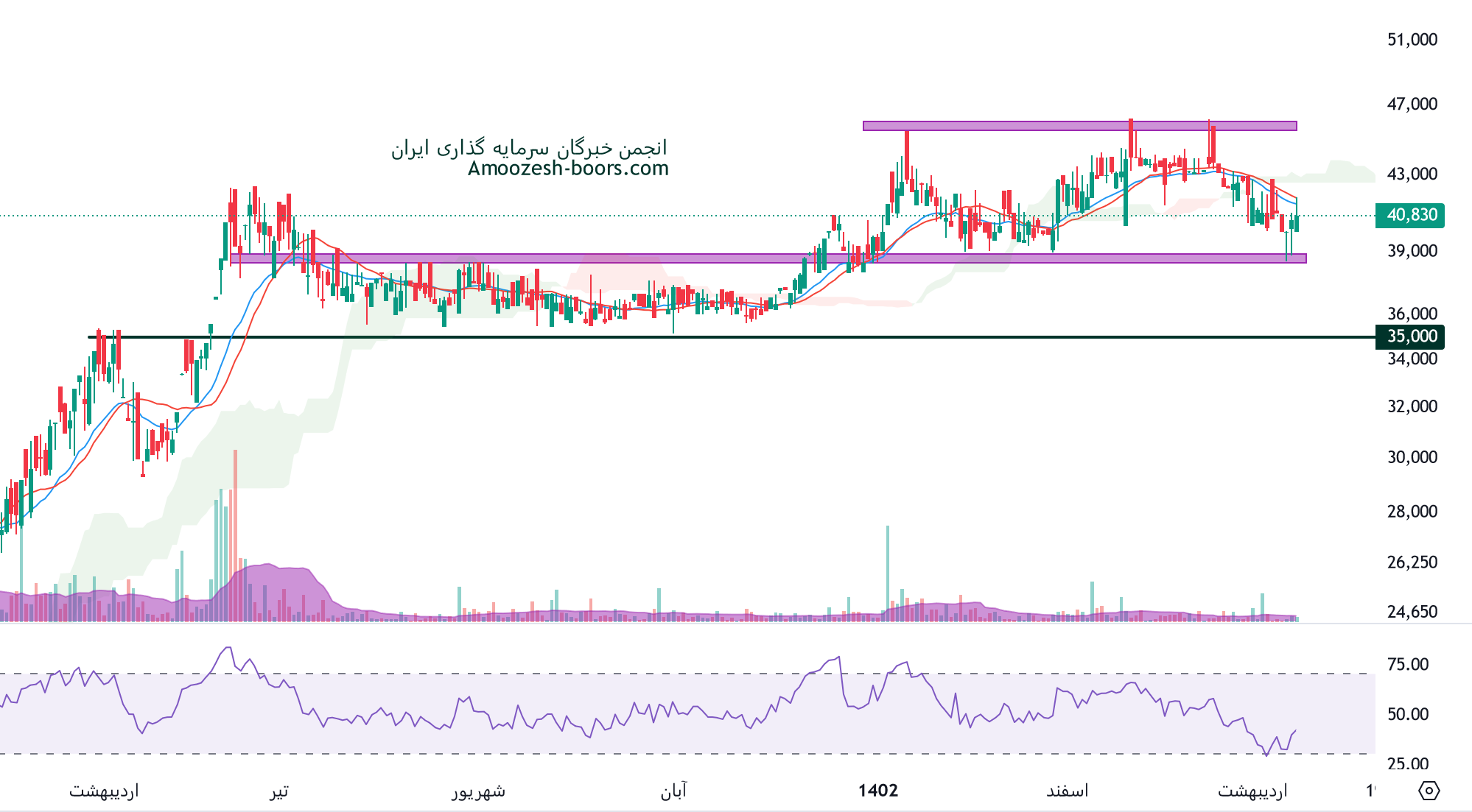 بررسی نمودار قیمتی سهم دفرا نشان میدهد که روند فعلی صعودی است. در صورت از دست دادن حمایت 38000 ریال، حمایت بعدی در محدوده 34000 ریال پیشبینی میشود.