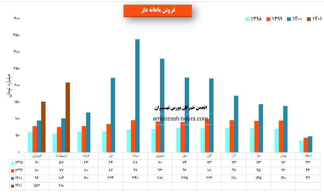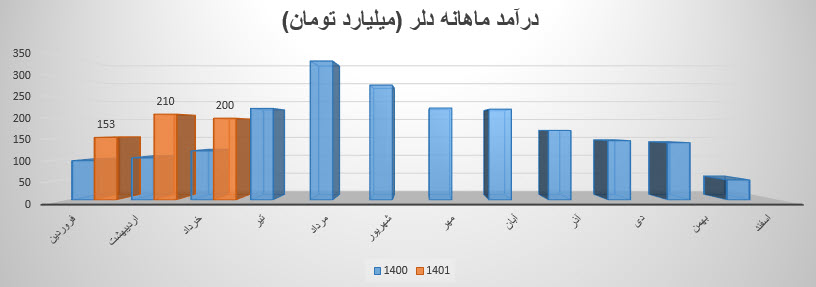 شرکت دارو سازی اکسیر با نماد دلر در فروردین ماه 1401 حدود مبلغ 153 میلیارد تومان درآمد داشته که این میزان در مقایسه با ماه گذشته 212% و همچنین در مقایسه با مدت مشابه سال گذشته 59% رشد درآمد پیدا کرده است.