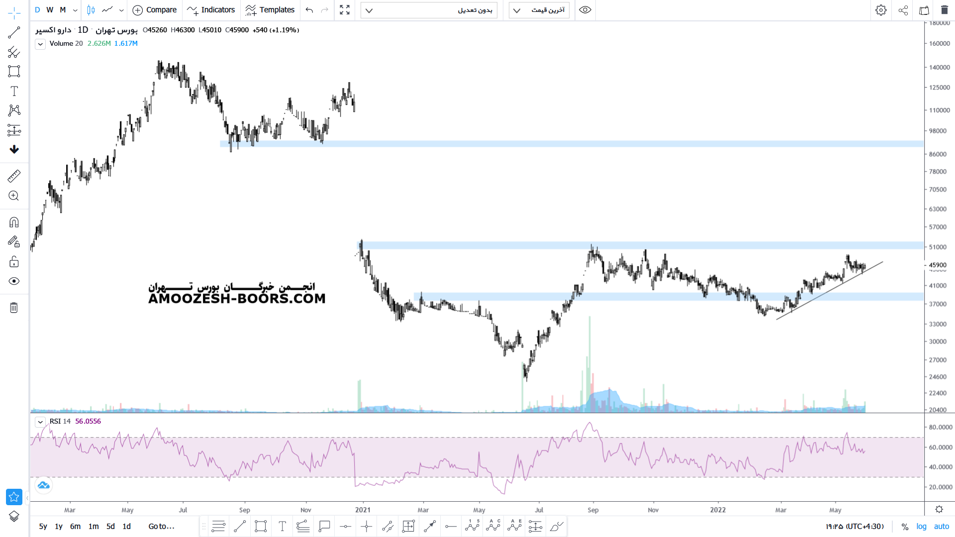 قیمت پس از رشد از محدوده حمایتی ۳۷۰۰ تومان تا محدوده مقاومتی ۵۱۰۰ تومان با بروز واکنش منفی نسبت به این محدوده مقاومتی وارد اصلاح شده است. اکنون حمایت خط روند صعودی خود را در پیش دارد که در صورت حمایت می تواند مجددا مقاومت محدوده ۵ هزار و ۱۰۰ تومان را تست کند اما در صورت شکست این حمایت می تواند تا حمایت مرحله ۳۸۰۰ تومان نیز اصلاح خود را ادامه دهد.