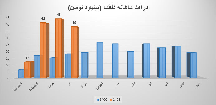 دلقما در عملکرد تیر ماه خود معادل 397,907 میلیون ریال درآمد کسب نموده که نسبت به دوره 1 ماهه مشابه سال قبل 118% افزایش داشته است.با وجود افت 13 درصدی درآمد نسبت به ماه گذشته همچنان نسبت به میانگین ماه های سال جاری 18 درصد بیشتراست.