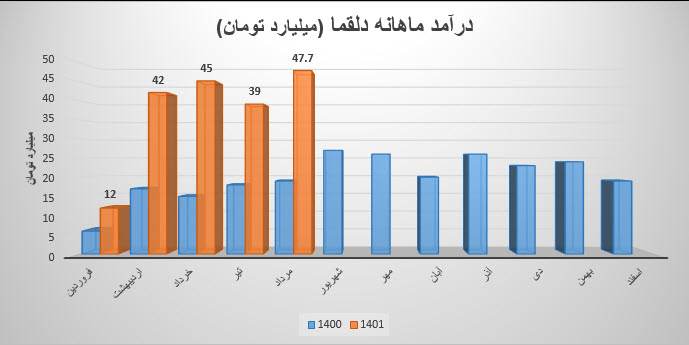 سهم دلقما در دوره یک ماهه منتهی به 31 مرداد ماه 1401، مبلغ 47.7 میلیارد تومان درآمد داشته که دوره نسبت به ماه قبل 20% افزایش و نسبت به میانگین ماه های قبل 36% افزایش داشته است.