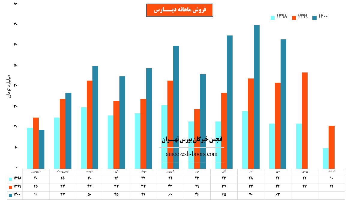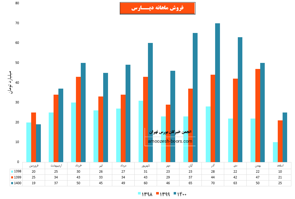 سهم دپارس  در دی ماه حدود 72 میلیارد تومان درامد داشته که در مقایسه با درامد ماه گذشته با 10درصد افت و همچنین در مقایسه با مدت مشابه سال گذشته با 50 درصد رشد روبروشده است. میلیارد تومان فروش داخلی داشته که با توجه به کسر مبلغ 9 میلیارد تومان بابت برگشت های فروش و تخفیف ها خالص فروش ماه دپارس مبلغ 63 میلیارد می شود