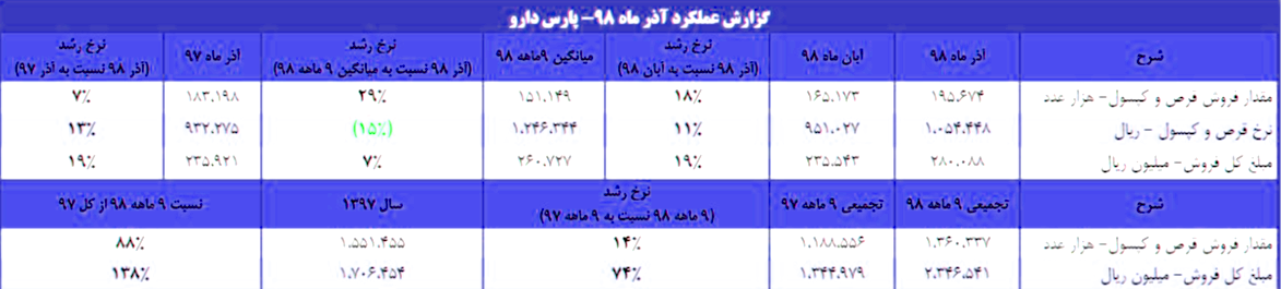 اما در بررسی حجم فروش قرص  و کپسول، دپارس نتوانست روند افزایشی ماه های اخیر خود را  ادامه دهد. دپارس دردی ماه با 26 درصد افت نسبت به آذر ماه نتوانست بیشتر از 150 هزار عدد از قرص  وکپسول خود را به فروش برساند.