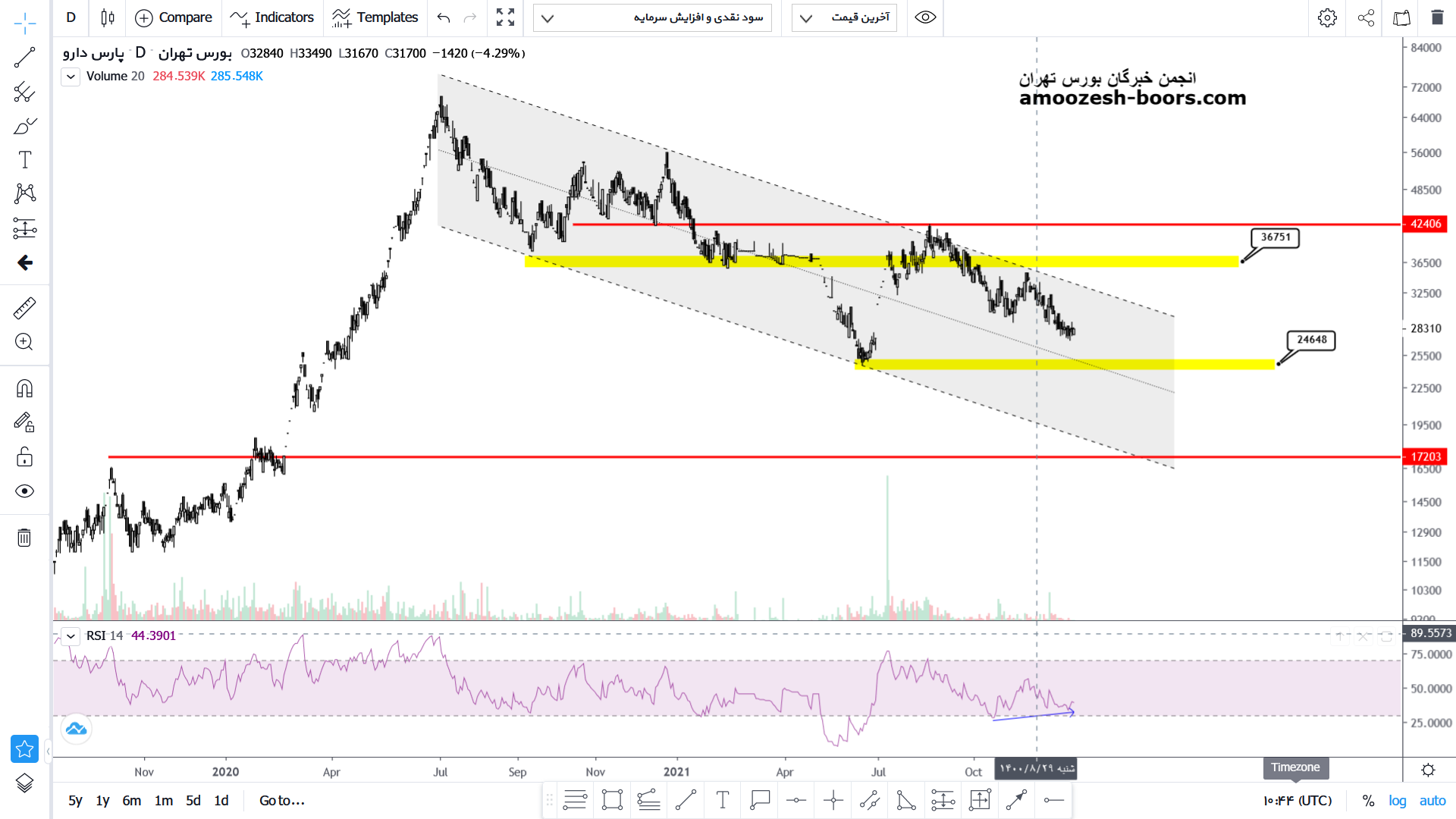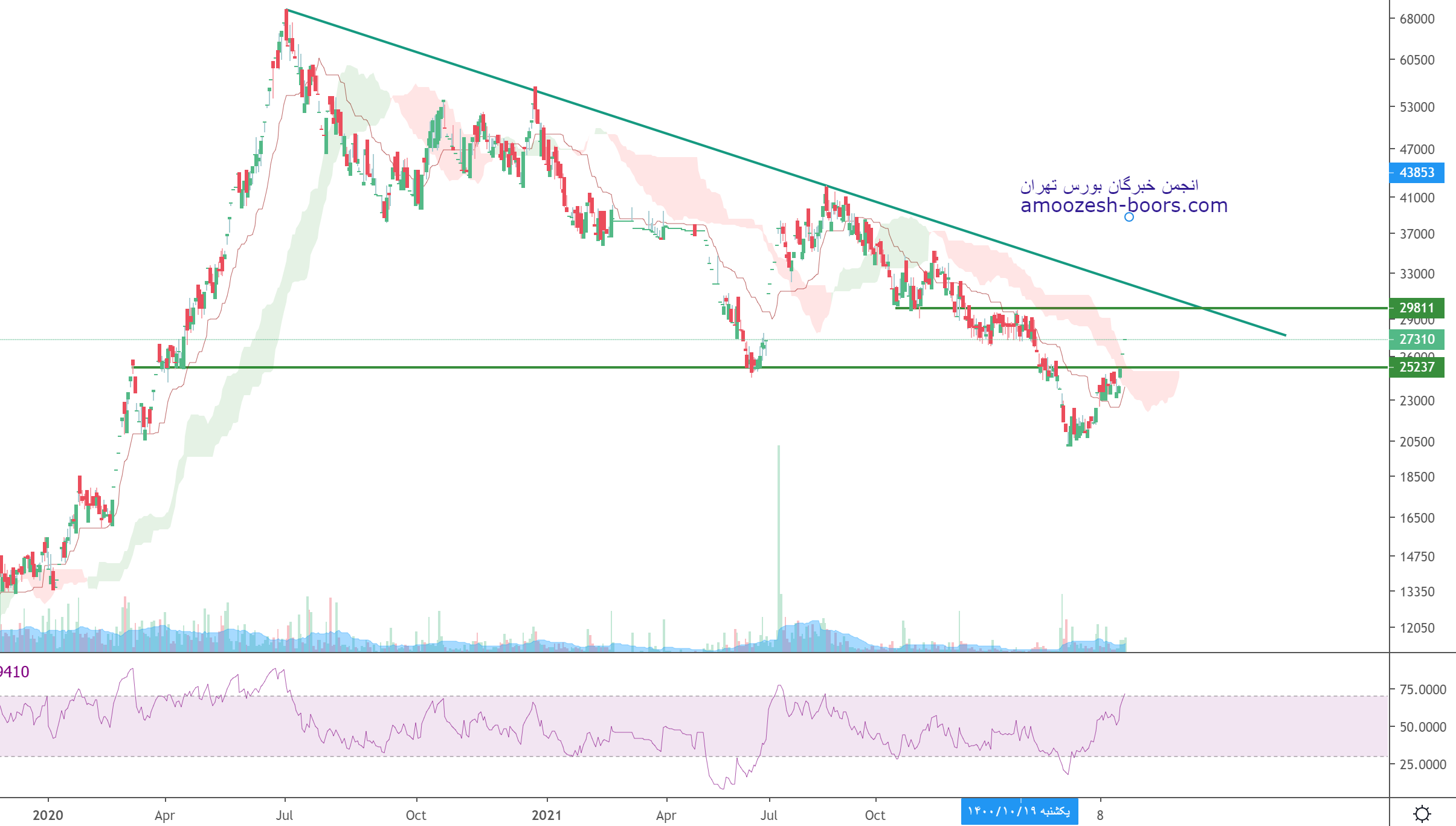 قیمت  سهم دپارس در یک کانال نزولی در حال اصلاح میباشد که محدوده حمایتی 2500 را پیش روی خود دارد که درصورت واکنش مثبت به این محدوده،سیگنال ورود صادرو قیمت میتواند تا سقف کانال نزولی خود یعنی محدوده 3000 تومان و در صورت شکست سقف کانال نزولی تا محدوده 3700 تومان نیز صعود کند و درصورت عدم حمایت قیمت  سهم دپارس میتواند تا کف کانال نزولی خود یعنی محدوده حمایتی 1700 تومان نزول کند