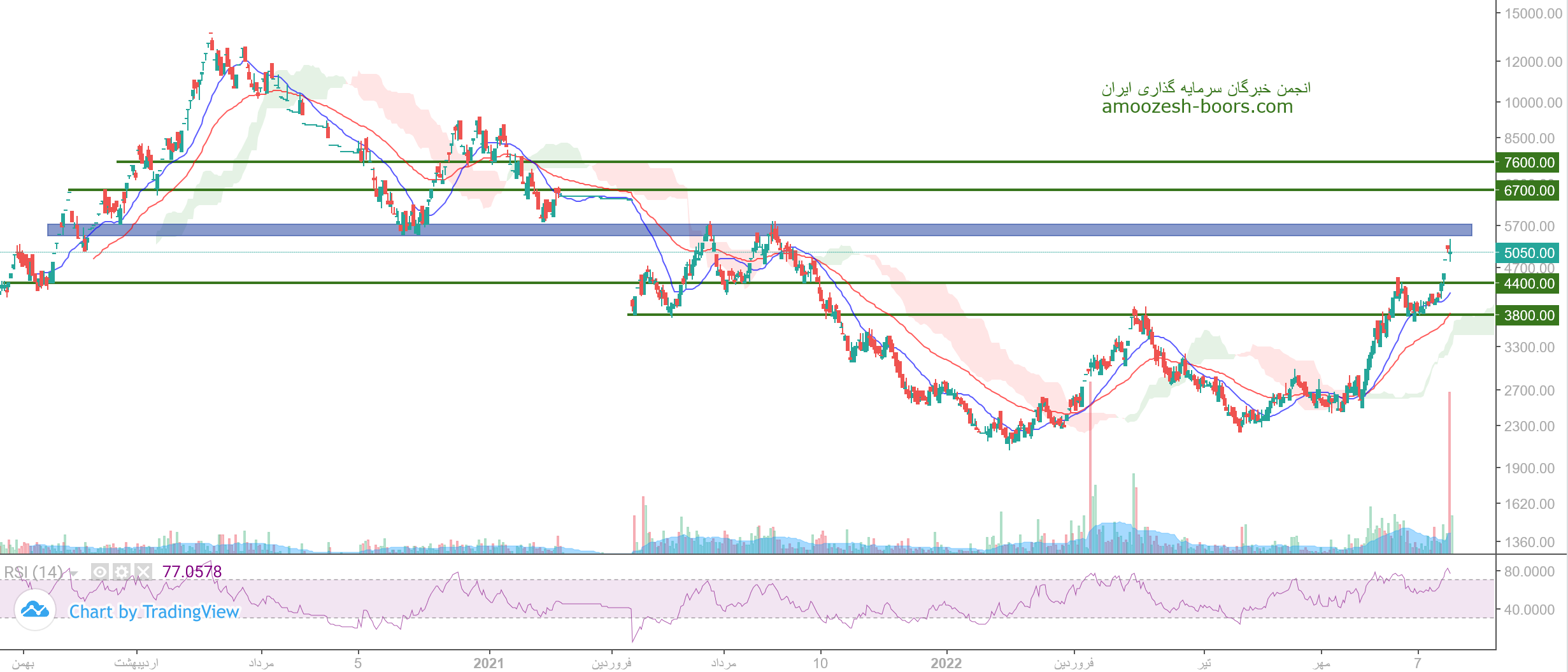 قیمت پس از برخورد به ناحیه مقاومتی مهم ۳۷۰ تومان مجدد به درون کانال بازگشته و از روی حمایت ناحیه ۲۰۰تومان مجدد حمایت شده و اکنون مقاومت ناحیه ۳۷۰ تومان را پیش روی دارد که میتواند در صورت عبور از آن رشد خود را تا مقاومت ۵۷۰ تومان نیز ادامه دهد.