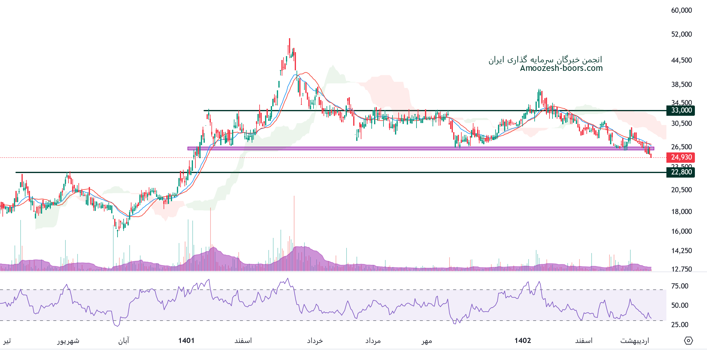 مقاومت دکیمی 27500 ریال: اگر سهم بتواند با حجم معاملات بالا این سطح را بشکند، احتمال حرکت به سمت مقاومت بعدی در محدوده 33000 ریال افزایش مییابد. این مقاومت میتوانند بهعنوان سیگنال برای ادامه روند صعودی عمل کند.